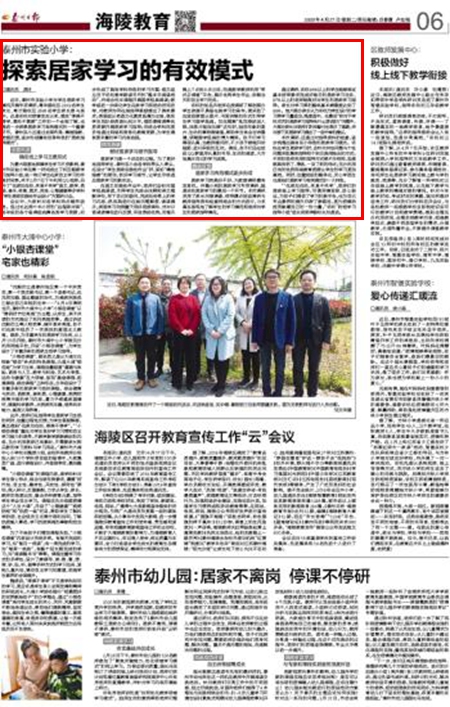 此文刊登于2020年4月21日《泰州日报 海陵教育专版》。