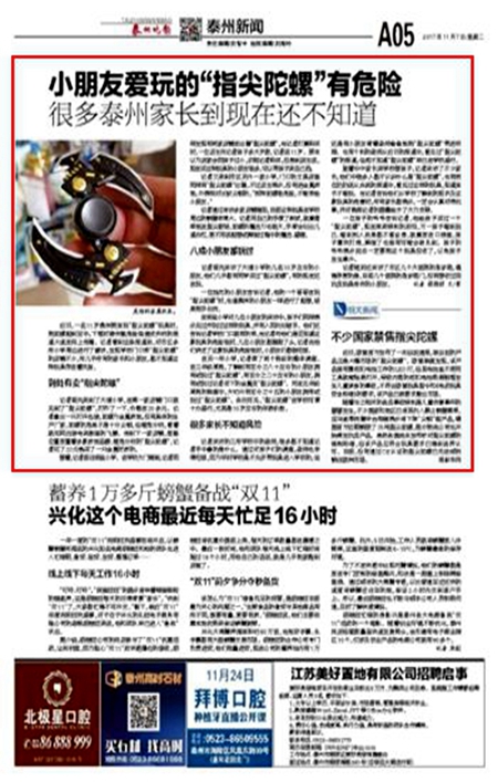 《泰州晚报》小朋友爱玩的“指尖陀螺”有危险 很多泰州家长到现在还不知道