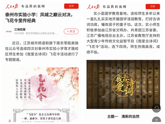 近日,江苏城市频道和旗下南京零距离微信公众号连续四次对泰州市实验小学师生参加《我爱古诗词》飞花令活动进行了专题报道。