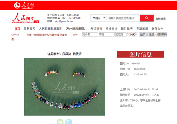 《人民网》图片新闻 我微笑 我快乐 来源:新华网 人民网 作者:王芹 发布时间:2020-06-27 浏览次数: 次 【字体:小 大】 2020年5月8日,江苏省泰州市大冯中心小学学生在操场上拼出笑脸图案。 此文刊登于2020年5月8日《人民网》http://vip.people.com.cn/albumsDetail?aid=1325459&pid=9196095&from=timeline&isappinstalled=0 分享到: 【打印正文】