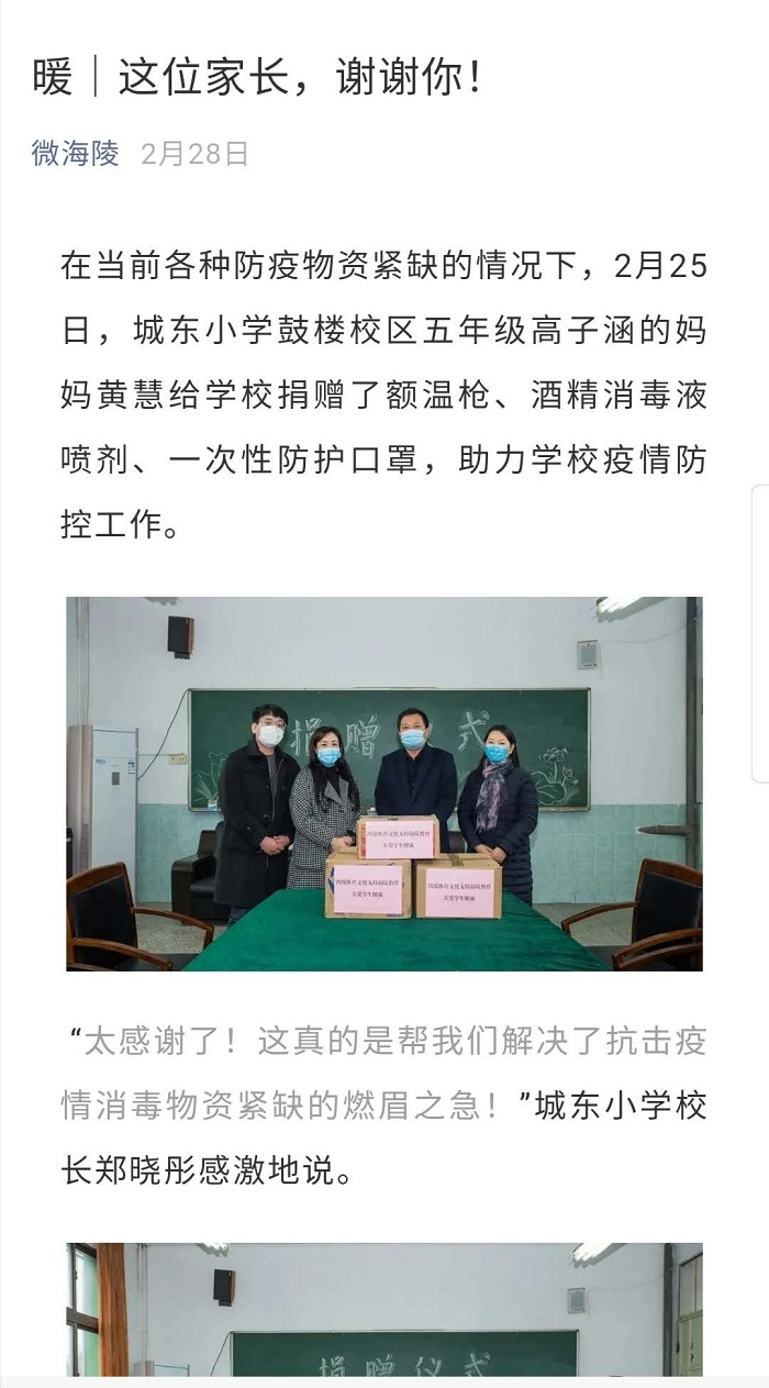 在当前各种防疫物资紧缺的情况下,2月25日,城东小学鼓楼校区五年级高子涵的妈妈黄慧给学校捐赠了额温枪、酒精消毒液喷剂、一次性防护口罩,助力学校疫情防控工作。