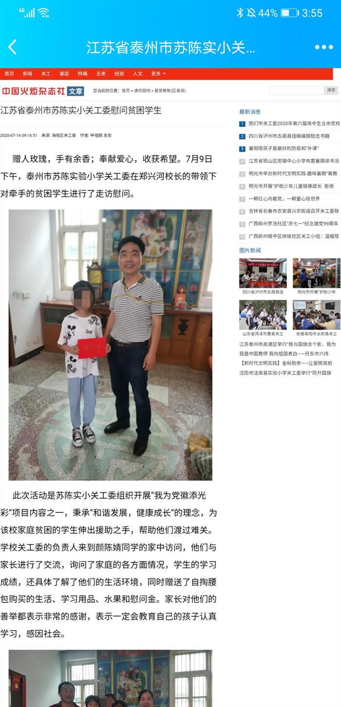 赠人玫瑰,手有余香;奉献爱心,收获希望。7月9日下午,泰州市苏陈实验小学关工委在郑兴河校长的带领下对牵手的贫困学生进行了走访慰问。