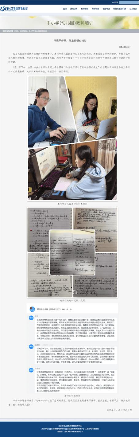 在全民抗击新冠肺炎疫情的特殊背景下,泰州市幼儿园的老师们自觉宅家抗疫。病毒阻挡了开学的脚步,却挡不住市幼人教研的热情。市幼领导班子及时调整思路,利用“学习强国”平台召开视频会议研究商讨并确定线上教研活动的计划和方案。2月22日下午,全园130多位老师利用网上平台围绕“如何进行活动区材料分层式投放”的话题以网络讲座和线上研讨的方式开展教研,大家认真聆听讲座,积极互动,激烈研讨。