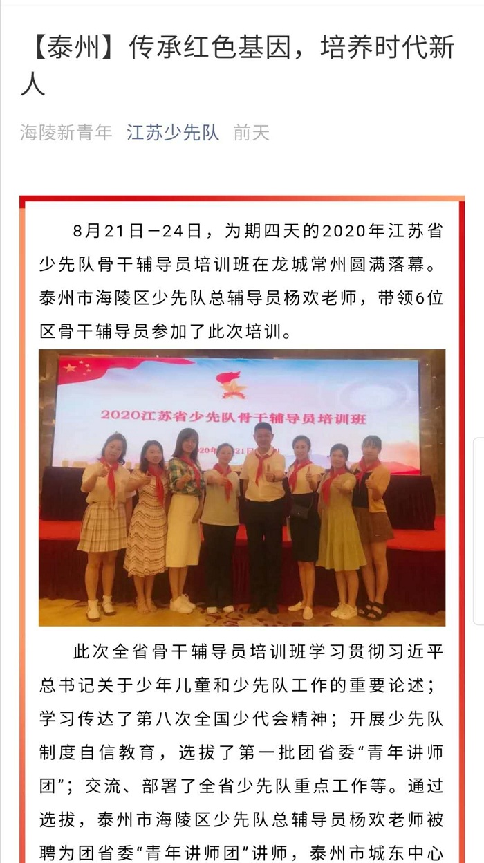 8月21日—24日,为期四天的2020年江苏省少先队骨干辅导员培训班在龙城常州圆满落幕。泰州市海陵区少先队总辅导员杨欢老师,带领6位区骨干辅导员参加了此次培训。