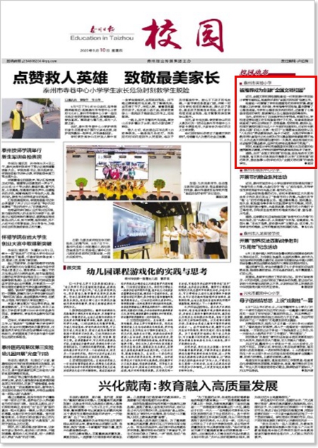 《泰州日报》泰州市实验小学被推荐成为创建“全国文明校园”