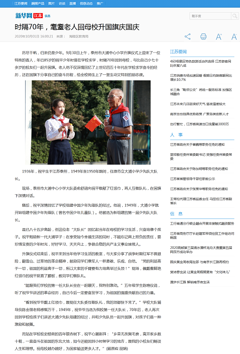 《新华网》时隔70年,耄耋老人回母校升国旗庆国庆
