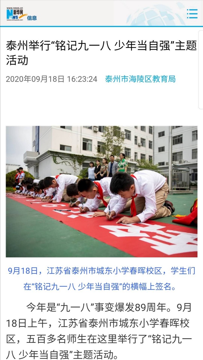 《新华网》泰州举行“铭记九一八 少年当自强”主题活动 来源:城东小学 作者:沈文华 顾原崧 发布时间:2020-10-16 浏览次数: 次 【字体:小 大】 泰州举行“铭记九一八 少年当自强”主题活动 通过集体默哀、同声呼号、签名墙签名、听故事、唱国歌、谈感想等活动,告诫全校师生铭记历史、缅怀先烈,进一步增强学生从小树立报效祖国的理想信念。(沈文华 顾原崧) 本新闻20200918发表于新华网http://www.js.xinhuanet.com/2020-09/18/c_1126511508.htm 分享到: 【打印正文】 相关内容