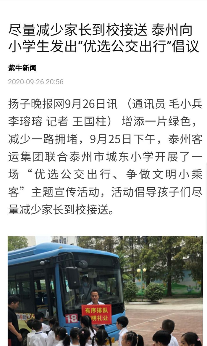 《扬子晚报网》尽量减少家长到校接送 泰州向小学生发出“优选公交出行”倡议