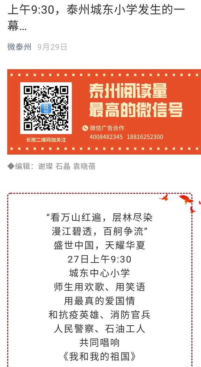 《微泰州》上午9:30,泰州城东小学发生的一幕… 来源:城东小学 作者:田恬 发布时间:2020-10-22 浏览次数: 次 【字体:小 大】 “看万山红遍,层林尽染漫江碧透,百舸争流”盛世中国,天耀华夏27日上午9:30城东中心小学师生用欢歌、用笑语用最真的爱国情和抗疫英雄、消防官兵人民警察、石油工人共同唱响《我和我的祖国》 本视频于20200229发表于微泰州https://mp.weixin.qq.com/s/B2p3JXzAF8EbP22MpfIxSw 分享到: 【打印正文】 相关内容