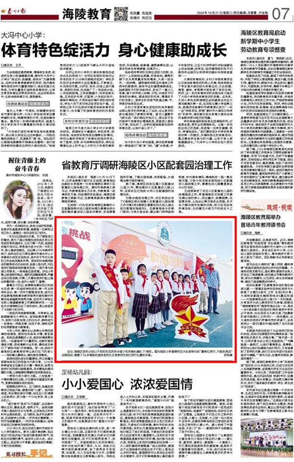 《泰州日报》图片新闻 来源:城东小学 作者:田恬 发布时间:2020-11-04 浏览次数: 次 【字体:小 大】 近日,海陵区各校分别以不同的形式庆祝中国少年先锋队建队71周年。图为城东小学春晖校区大队部举办的“最美红领巾,不服来挑战”主题活动,邀请了84岁高龄的退休老校长王俊美担任系红领巾比赛的评委。田恬摄 本文于20201021发表于《泰州日报》第A07版 分享到: 【打印正文】 相关内容