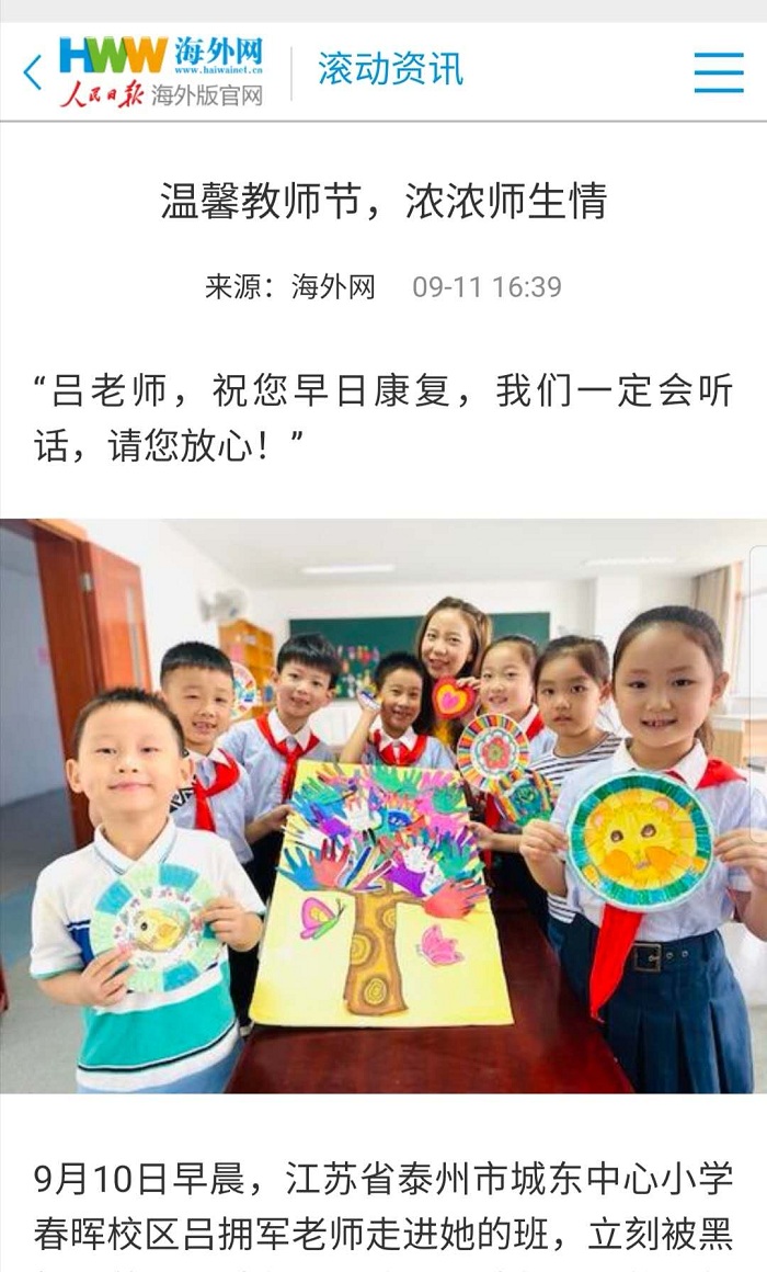 二(1)班吕老师已经教了一学期,她与孩子们结下了深深的感情。开学才几天,她放不下班上42个孩子,也不想增添学校的工作负担,坚持向校长要求正常到班工作。搭班的王乾老师深为前辈的敬业精神感动,她指导孩子们制作了“心愿树”,作为教师节的礼物送给吕老师,祝她早日康复。