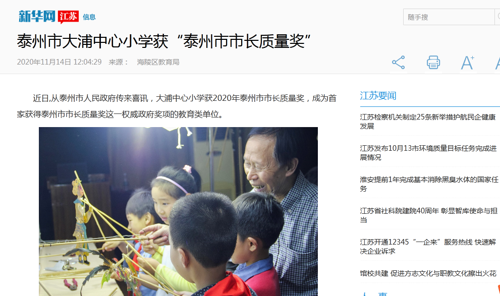 《新华网》泰州市大浦中心小学获“泰州市市长质量奖”