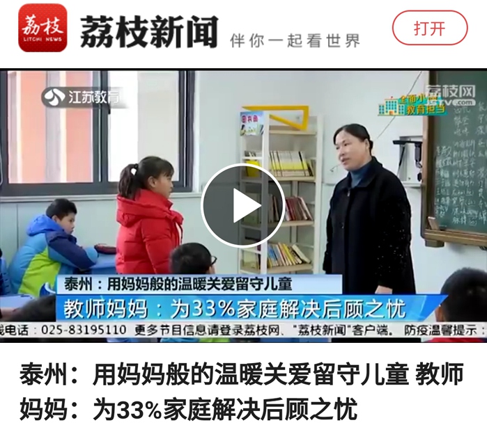 《荔枝新闻》泰州:用妈妈般的温暖关爱留守儿童 来源:荔枝新闻 作者:江苏教育 发布时间:2021-01-05 浏览次数: 次 【字体:小 大】 泰州:用妈妈般的温暖关爱留守儿童。教师妈妈:为33%家庭解决后顾之忧。 视频链接:http://v.jstv.com/wap/a/20201231/1609383595787.shtml?jsbcApp=1 分享到: 【打印正文】 相关内容