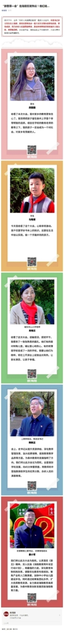昨天下午,全市“办好人民满意的教育”推进大会召开。市委书记史立军在会上强调,要切实把教育这一最大民生实事办得更有质量、更有成效,努力办好人民满意的教育,推动泰州教育改革发展迈上新台阶、再攀新高峰。会议召开后,海陵全区上下反响热烈,大家对泰州教育发展充满期待。