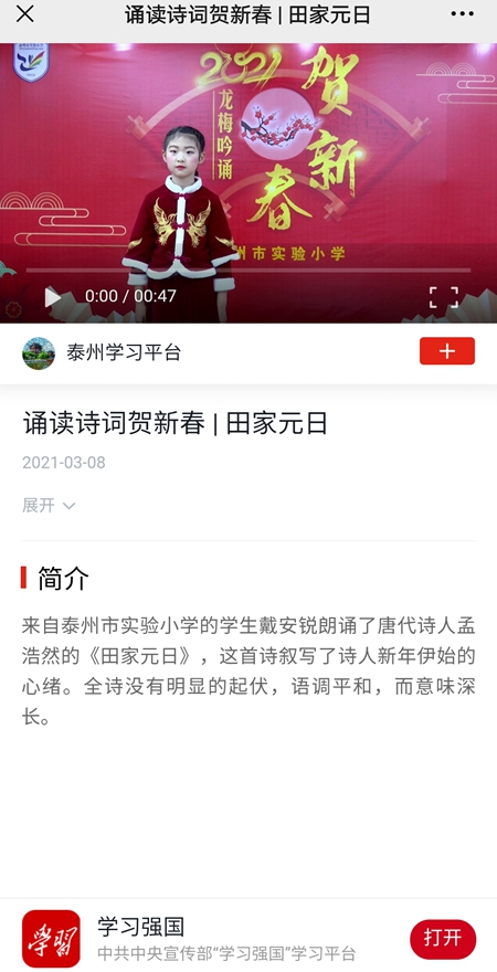 《学习强国》泰州市实验小学诵读诗词贺新春《田家元日》 来源:学习强国 作者:卞俊 黄荣荣 发布时间:2021-03-11 浏览次数: 次 【字体:小 大】 来自泰州市实验小学的学生戴安锐朗诵了唐代诗人孟浩然的《田家元日》,这首诗叙写了诗人新年伊始的心绪。全诗没有明显的起伏,语调平和,而意味深长。 此视频登于2021年3月8日《学习强国》。 网址链接: https://article.xuexi.cn/articles/index.html?art_id=6683485186114874674&item_id=6683485186114874674&study_style_id=video_default&t=1615190437489&showmenu=false&ref_read_id=48960ce3-04c9-4095-92a8-7b3429df80b3_1615212146138&pid=&ptype=-1&source=share&share_to=wx_single 分享到: 【打印正文】 相关内容