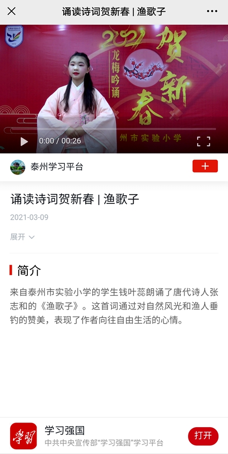 《学习强国》泰州市实验小学诵读诗词贺新春《渔歌子》 来源:学习强国 作者:卞俊 黄荣荣 发布时间:2021-03-12 浏览次数: 次 【字体:小 大】 来自泰州市实验小学的学生钱叶蕊朗诵了唐代诗人张志和的《渔歌子》。这首词通过对自然风光和渔人垂钓的赞美,表现了作者向往自由生活的心情。 此视频登于2021年3月9日《学习强国》。 网址链接: https://article.xuexi.cn/articles/index.html?art_id=16577780973620637598&item_id=16577780973620637598&study_style_id=video_default&t=1615275096807&showmenu=false&ref_read_id=0d404c0c-4075-47fb-9d16-9a4dbc95b0f3_1615291426990&pid=&ptype=-1&source=share&share_to=wx_feed 分享到: 【打印正文】 相关内容
