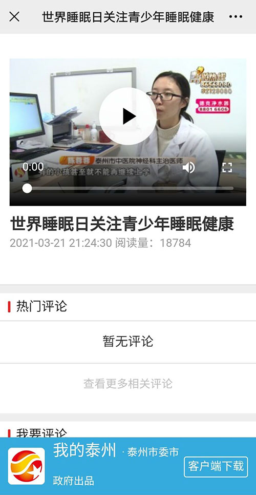 《我的泰州》世界睡眠日关注青少年睡眠健康 来源:二中附中 作者: 发布时间:2021-03-24 浏览次数: 次 【字体:小 大】 本视频于2021年3月21日发布于《我的泰州》世界睡眠日关注青少年睡眠健康 http://share.mytaizhou.net/?_hgOutLink=vod/NewsDetail&id=474702 分享到: 【打印正文】