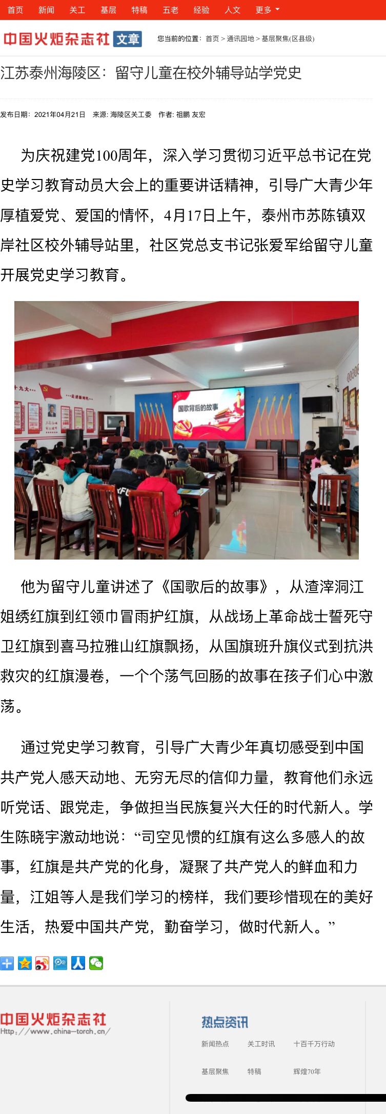 《中国火炬杂志社》江苏泰州海陵区:留守儿童在校外辅导站学党史