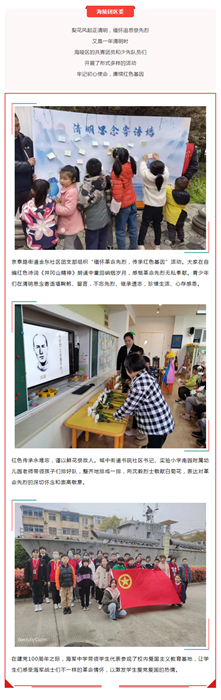 京泰路街道金东社区团支部组织“缅怀革命先烈,传承红色基因”活动。大家在自编红色诗词《井冈山精神》朗诵中重回硝烟岁月,感慨革命先烈无私奉献。青少年们在清明思念寄语墙鞠躬、留言,不忘先烈、继承遗志,珍惜生活、心存感恩。