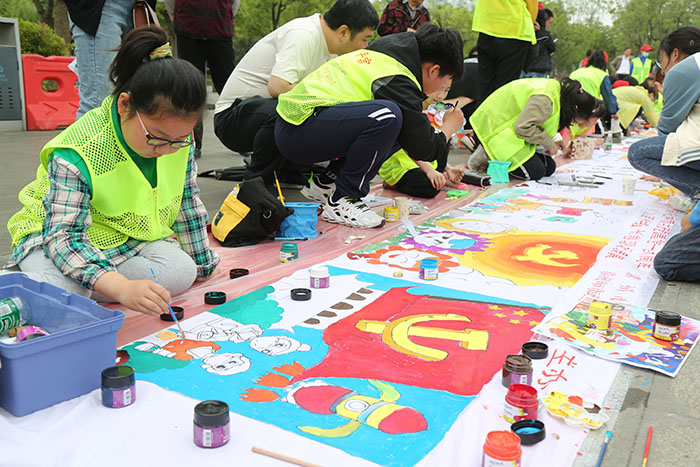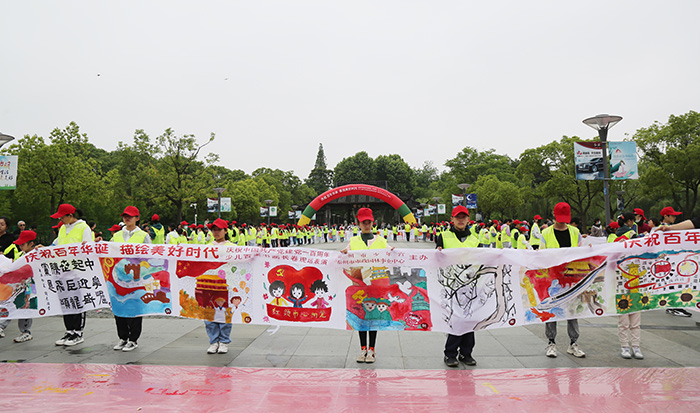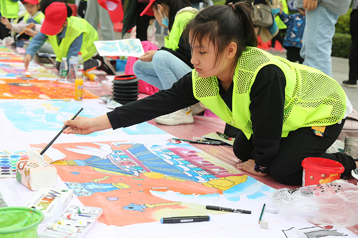 奇思妙想的漫画,刻画入微的国画,色彩绚丽的儿童画……5月23日上午,在泰山公园东门广场上,百余名来自泰州市少年宫中国青少年书画院泰州分院的学员,身穿荧光绿背心,头戴小红帽围在广场四周,他们或蹲或卧或趴,在百米长卷上以“庆祝百年华诞 描绘美好时代”为主题挥毫作画。