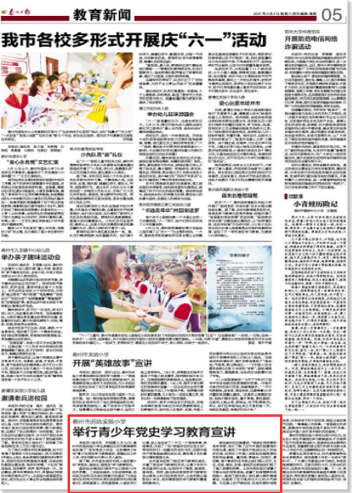 《泰州日报》苏陈实小:举行青少年党史学习教育宣讲