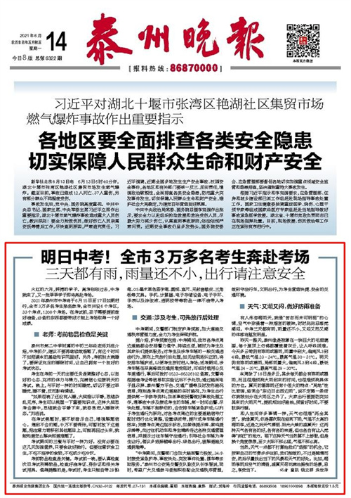 《泰州晚报》明日中考!全市3万多名考生奔赴考场