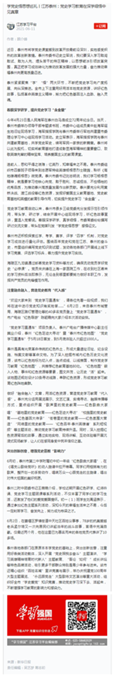 党史学习教育启动以来,泰州市县乡三级党委充分发挥示范引领作用,带头学、研讨学,结合开展中心组现场学习,听红色故事宣讲,重温入党誓词。着眼深学研学、真学细悟,市委常委纷纷撰写研讨交流文章,带头在党媒刊发“学党史悟思想”感悟征文。