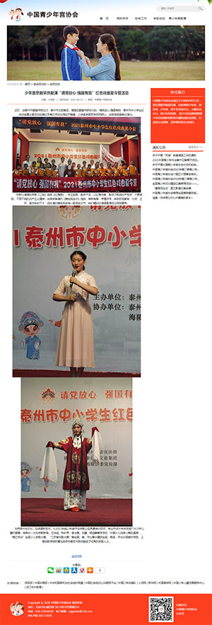 近日,由泰州市委宣传部主办,泰州市文旅集团、海陵区委宣传部协办的“请党放心 强国有我”泰州市中小学生红色戏曲夏令营活动在梅兰芳梅兰芳纪念馆拉开帷幕,少年宫京剧班学员郑舒心、徐笑微受邀参加演出。