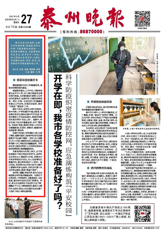 此文刊登于2021年8月27日《泰州晚报》第A01版 封面