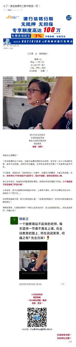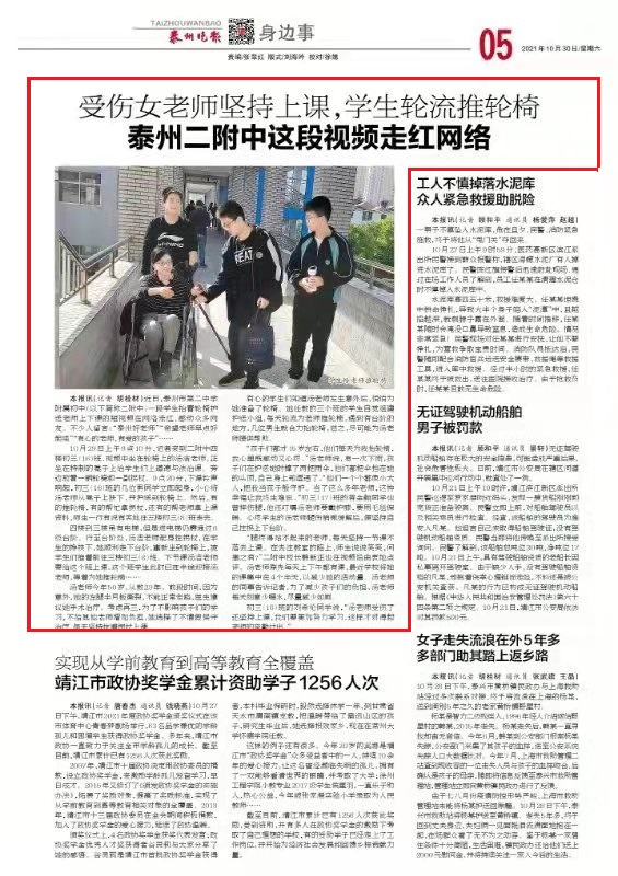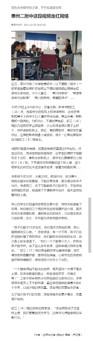 链接:受伤女老师坚持上课,学生轮流推轮椅 泰州二附中这段视频走红网络 http://sz.tznews.cn/tzwb/pc/col/202110/30/content_104841.html