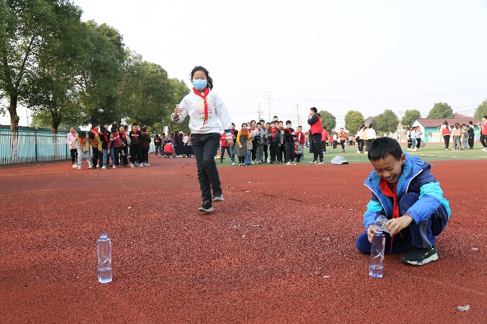 活动中,少年宫的教师志愿者们精心设计了“快乐传递”“螃蟹背西瓜”“无敌风火轮”“欢乐袋鼠跳”等12个体育活动项目,近800名学生参与其中。“加油!加油!”操场上传来阵阵呐喊助威声,原来是孩子们正在玩“运水接力赛”。随着一声哨响,大家手持装满水的水杯,并根据比赛规则,采用单脚跳、蛙跳等姿势,奋力奔向终点。在整组成员的齐心协力下,空水瓶中的水位线不断上升,加油声、欢笑声、呐喊声不绝于耳,形成了一道青春活力的风景线!