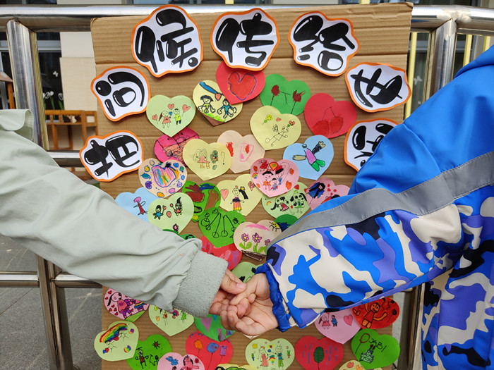 孩子们组成了“小小问候团”,充分发挥想象,用画笔画出笑脸,小花、海洋、绿地等一切美好的事物,制作成爱心问候墙,还向哥哥姐姐、执勤的老师、保健老师、食堂的叔叔阿姨、门卫的保安爷爷送去了问候,体验问候带给大家的快乐。