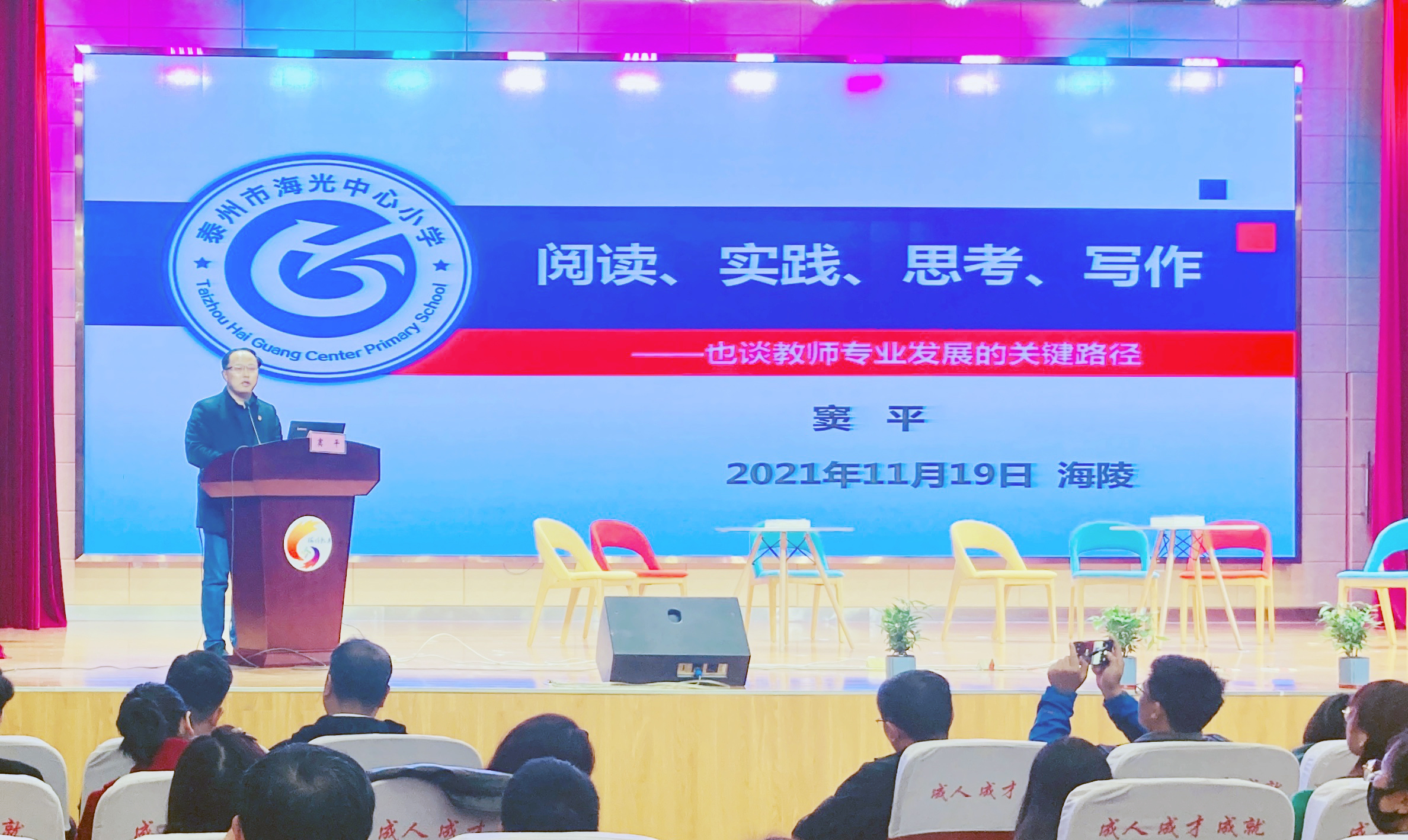 在专家讲座环节,省特级教师,海光小学党支部书记、校长窦平为大家带来了《阅读、实践、思考、写作——也谈教师专业发展的关键路径》的专题讲座。窦校长从自身成长经历出发,分享了自己从一份报纸打开阅读之路并逐渐走向深度阅读的经验和策略。对于如何在阅读的基础上开展研究,窦校长提出了“宁在自家找宝,不在他家挖金;宁在点上打井,不在面上挖坑......”等课题研究的基本策略,他认为教师的课题研究应该是与教学实践相互结合的自主研究,是一种小切口有实效的研究。
