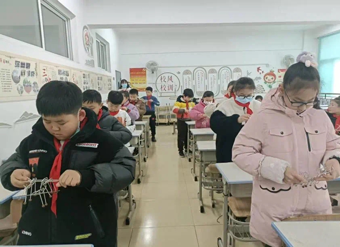 三、四年级的学生举行了“巧解九连环”比赛。比赛现场参赛学生沉着冷静地拆解九连环,教室里“叮叮当当”之声不绝于耳,到处弥漫着紧张激烈的比赛气氛。环儿在学生们的手中飞舞穿插,一个个小铁环在学生们的巧手下不断从缠绕中自然散开,不一会儿,环环相扣的九个环就全部解下来了。