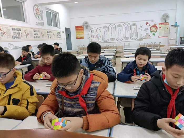 五、六年级的学生举行了“魔方转转转”比赛。每班推选三名选手参加,选手们手脑并用,小小魔方在手中飞速转动,很短的时间内一个个魔方复原了。选手们的实力在比赛中发挥的淋漓尽致。