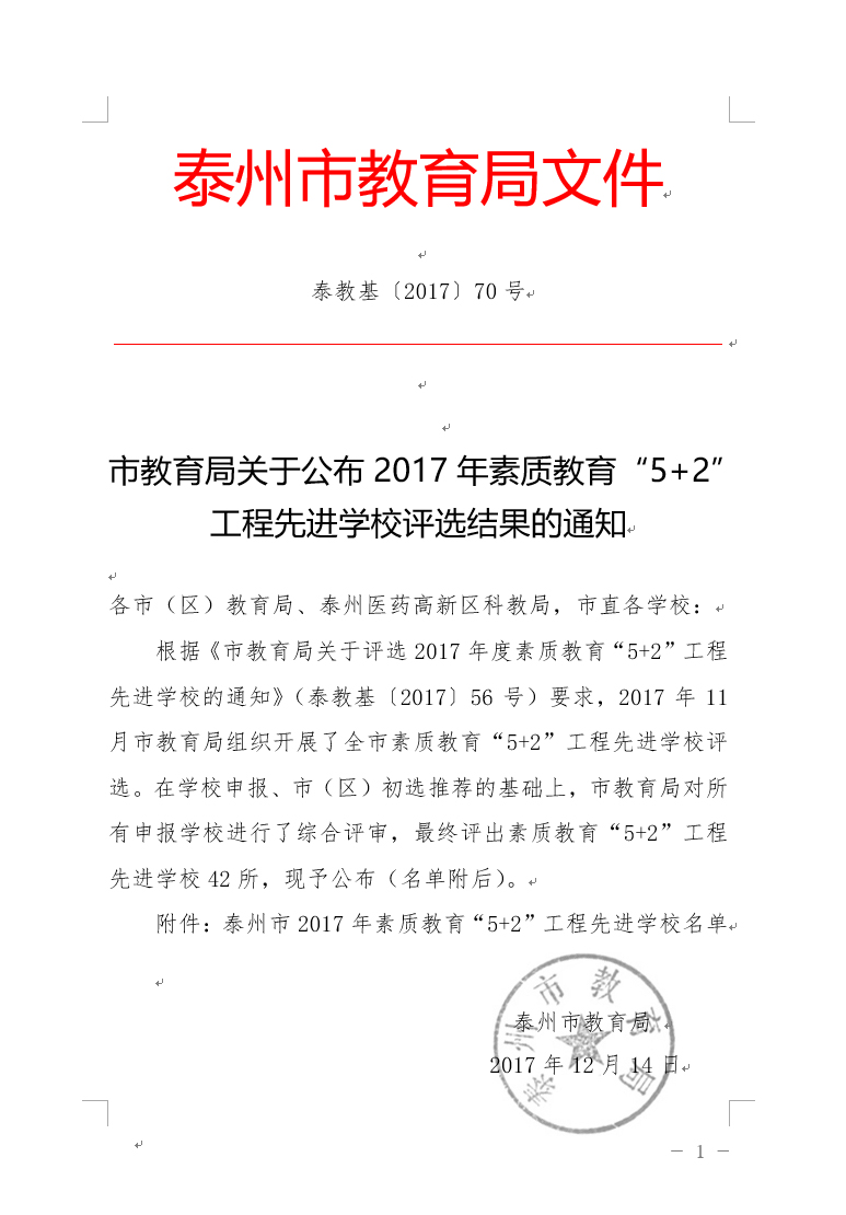 我区四所学校被评选为泰州市2017年素质教育“5+2”工程建设先进学校 来源:渔行 作者:孙磊 发布时间:2017-12-16 浏览次数: 次 【字体:小 大】 根据《市教育局关于评选2017年度素质教育“5+2”工程先进学校的通知》要求,2017年11月市教育局组织开展了全市素质教育“5+2”工程先进学校评选工作。在学校申报、市(区)初选推荐的基础上,市教育局对所有申报学校进行了综合评审,最终我区所属的泰州市海光中心小学、泰州市渔行实验学校、泰州市九龙实验学校、泰州市智堡实验学校四所学校被评选为泰州市2017年素质教育“5+2”工程先进学校。 分享到: 【打印正文】 相关内容