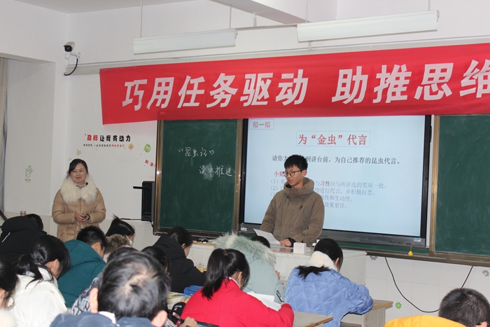 民兴中学葛海燕老师执教了《<昆虫记>读中推进》整本书阅读课。她从学生阅读体验入手,在充分阅读的基础上,用任务清单的形式,驱动学生阅读向纵深处延伸。同时,引导学生从文本出发,将在反复阅读中得到的独特体验用多种活动形式展现出来,鼓励学生充分展示自我,努力思考“虫性”与“人性”的关系。