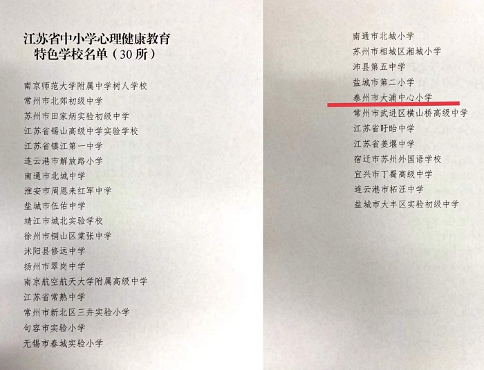 日前,从省教育厅传来喜讯,我区大浦小学被授予“省中小学心理健康教育特色学校”荣誉称号。据悉,这是泰州市唯一获此殊荣的小学。