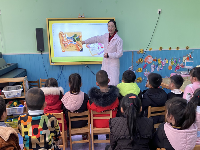 在市幼易居城分园的校园里,传出了孩子们一阵阵欢快的笑声,原来幼儿园里的保健医生戴冬升正在给孩子们开展一堂生动有趣的“爱耳”课。