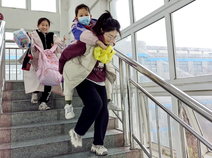 但是,正值疫情严峻时期,家长不能进入校园,孩子教室在五楼,腿脚不便,无法自行上下楼梯,这可愁坏了孩子的家长。班主任郑京京老师在了解了具体情况后,主动承担起了孩子上下楼梯的责任,抱不动,就背吧。其实,郑京京老师身材娇小,看上去有些“瘦弱”,但就是这样一位“瘦弱”的老师,用她不甚宽阔的肩膀背起了一个孩子的求学之路,撑起了家校共育的桥梁,身体力行,为孩子们做了很好的“爱”的教育。