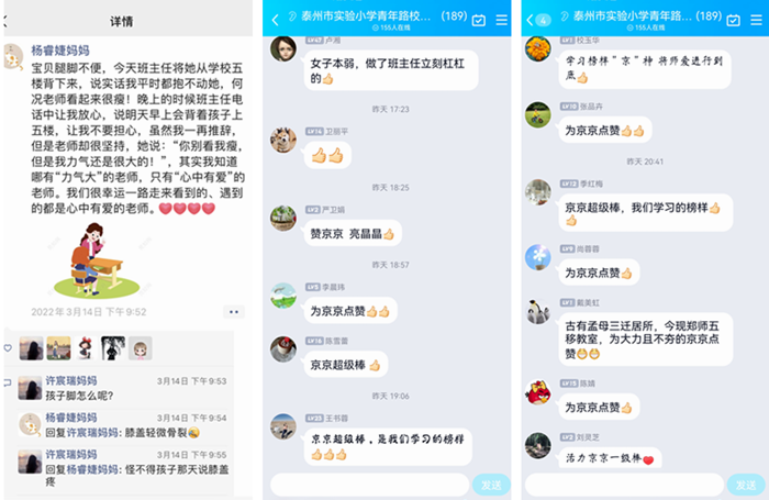 当有人将郑京京老师背杨杨的照片发到了教师群里,大家纷纷为她的举动点赞。“学习榜样‘京’神,将师爱进行到底!”“女子本弱,做了班主任立刻杠杠的。”“古有孟母三迁居所,今现郑师五移教室,为大力且不夯的京京点赞!”……看到大家为自己点赞的各种留言,郑京京老师却很谦虚,她说:“感谢大家的称赞,实在受之有愧。”