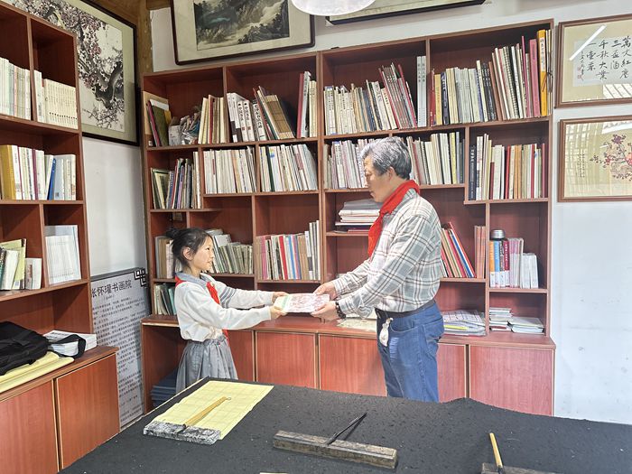 少先队员花楚妍:春风和煦,老师带领我们去稻河古街的张怀瓘书画院寻访。在书画院内我们看到了书法作品以及获得的各种奖项,我从张老师的作品中感受到书法的魅力和汉字的博大精深,书法不愧被称为无形的舞、无言的诗、无图的画、无声的乐。学习书法时,我还知道了一幅好作品可能要经过数十次的修改才能写好,不是一次就能成功。通过这次参观活动我明白了不管是练习书法还是做其他任何事都要勤奋努力、持之以恒、精益求精。
