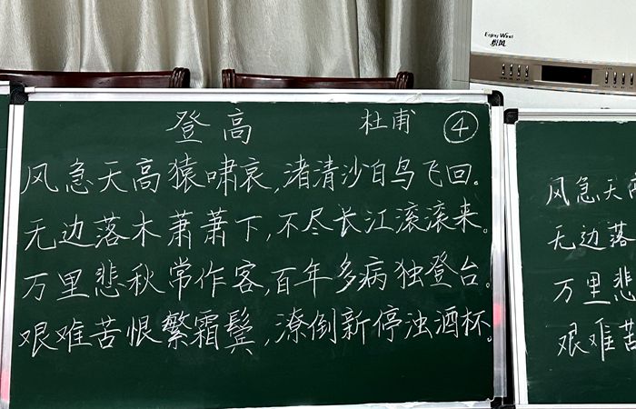 一手好字是教师的“立师之本”之一,粉笔字展示环节中,选手们在规定时间内完成杜甫《登高》的书写。比赛现场,参赛教师们横竖撇捺,提按顿挫,一丝不苟;一笔一画,用心用情,各有千秋。