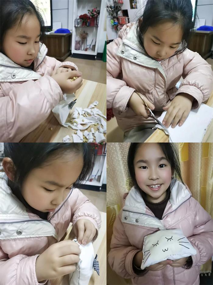 同学们制作沙包的热情非常高涨,他们准备了各式各样的彩色布料、针线以及剪刀,很多孩子都是第一次摸针线,裁剪布料——穿针引线——对折布面——翻面装沙——封口完成,这些看似简单,实际上对于孩子们来说却很难,很多同学因为不小心还扎破了手,但是他们却从眼、手、脑的协作劳动中体会到了实践的乐趣。
