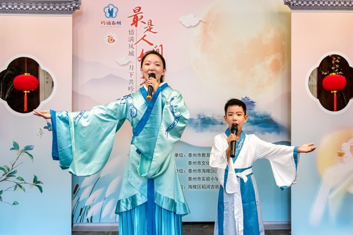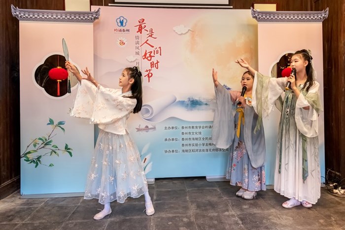 大家纷纷就自己喜欢的诗词进行朗诵、吟诵,从泰州市周山河小学姜红霞老师的《皓月中秋吟》到泰兴市济川中学陈娥老师的《诗经•陈风•月出》,从泰州实验学校张燕老师的《爱莲说》到泰州市实验小学丛龙梅老师的白话诗吟诵《乡愁》,从市文化馆国学班学生的《定风波》《一剪梅》到江苏省泰州中学附属初级中学的《诗经•关雎》……十三个节目时而气势磅礴,时而婉转悠扬,动听的声音、优美的舞蹈、精美的服饰与这古色古香的场景融为了一体,为这个“人间好时节”平添了无限美好的诗情画意。