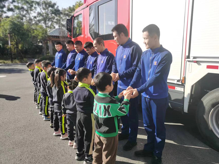 “为什么这辆消防车里装有泡沫?”“这辆消防车上面的超级大钳子是用来干什么的?”孩子们好奇地提出疑问。“因为有的时候需要用泡沫来灭火……”消防员叔叔娓娓道来。消防员叔叔给大家介绍完消防车、逃生知识后,还给孩子们穿上消防服,一起参观生活区,了解“蓝朋友”的训练日常。最后,消防员叔叔鼓舞着孩子们“想要做一名合格的勇士,首先要好好吃饭,多运动,有良好的身体素质,你们能不能做到?!”孩子们纷纷答应,并将自己准备的“平安果”亲手送给“蓝朋友”一起平安过节,希望他们每次出任务都能顺利救援,平安归来。