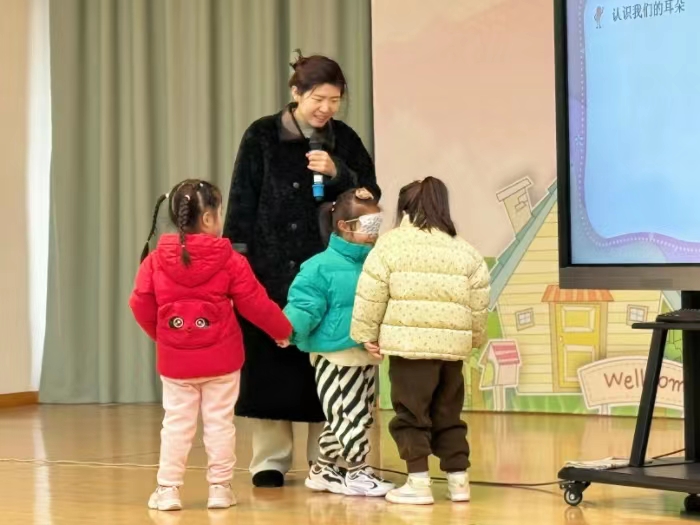 活动中,保健医生贾秋霞结合幼儿年龄特点,通过阅读绘本、视频、猜谜等形式,利用耳朵的模型讲解引导幼儿在生活中应尽量避免意外伤害耳朵的事故发生,让幼儿更加了解耳朵的构造及功能,知道爱耳护耳的有效方法。