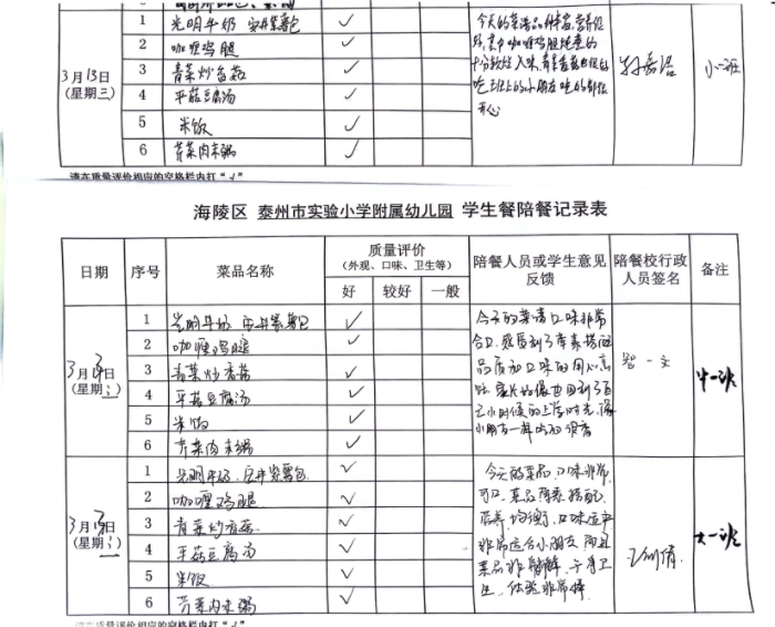 陪餐后,家长代表认真填写陪餐记录表,积极交流陪餐感受,充分肯定了幼儿园食堂环境、食品安全、午餐质量和幼儿自主服务的美好样态。大一班小宝妈妈深有感触地说:“这次参加陪餐活动,幼儿园向我们展示了从配餐到用餐的整个流程,所有的食材、用料都会上传至阳光食堂让大家监管,感谢幼儿园真正在幼儿用餐工作上严格把关,把幼儿当成自己的孩子,用心尽心做好幼儿用餐的每个细节工作,解决了家长的后顾之忧。”