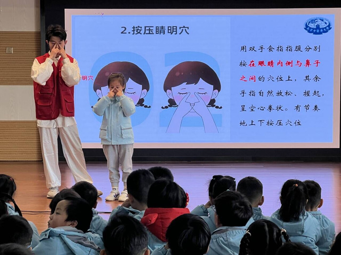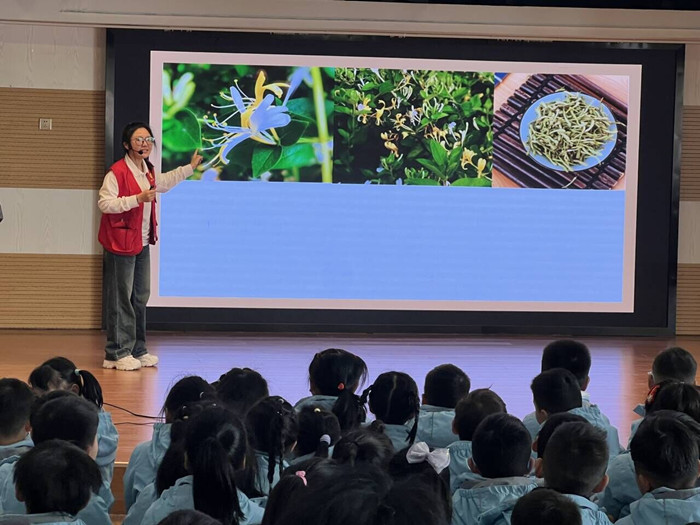 活动中,志愿者们为幼儿准备了内容丰富的中医药知识讲座。首先,他们用生动的图片、有趣的故事、动听的童谣,带领幼儿走进了神奇的中草药世界,帮助幼儿了解到了中医学的由来、中草药的种类等知识。接着,他们向幼儿介绍了金银花、枸杞、蒲地蓝等许多常见的中草药的性味、功效及用途,传递出健康生活的理念,鼓励幼儿多吃蔬菜水果,少吃零食,保持充足的睡眠和适当的运动。同时,通过互动问答的形式,让幼儿更加深入地了解中草药知识,培养他们的学习兴趣和好奇心。然后,他们教授了幼儿一些简单的中医养生方法,如穴位按摩、八段锦等,让幼儿在欢乐的氛围中感受中医文化的魅力。最后,他们组成一支支小分队,指导幼儿亲手制作中草药书签和香囊,提升幼儿动手能力,更加深入地了解中草药文化。