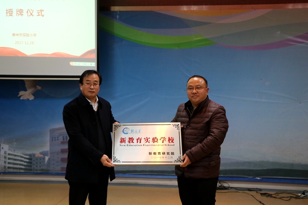 12月28日,泰州市实验小学举办新教育实验成果展示活动。新教育理事会副理事长兼秘书长、新教育研究院常务副院长陈东强为实验小学授牌,该校正式成为“新教育实验学校”。参加活动的还有新教育研究中心副主任李宜华、新教育研究院办公室主任杜涛、姜堰区教育局副局长林忠玲、海陵区教育局副局长姜凌、海陵区教育局督学刘荣、周荣桃以及该校全体师生、家长代表。